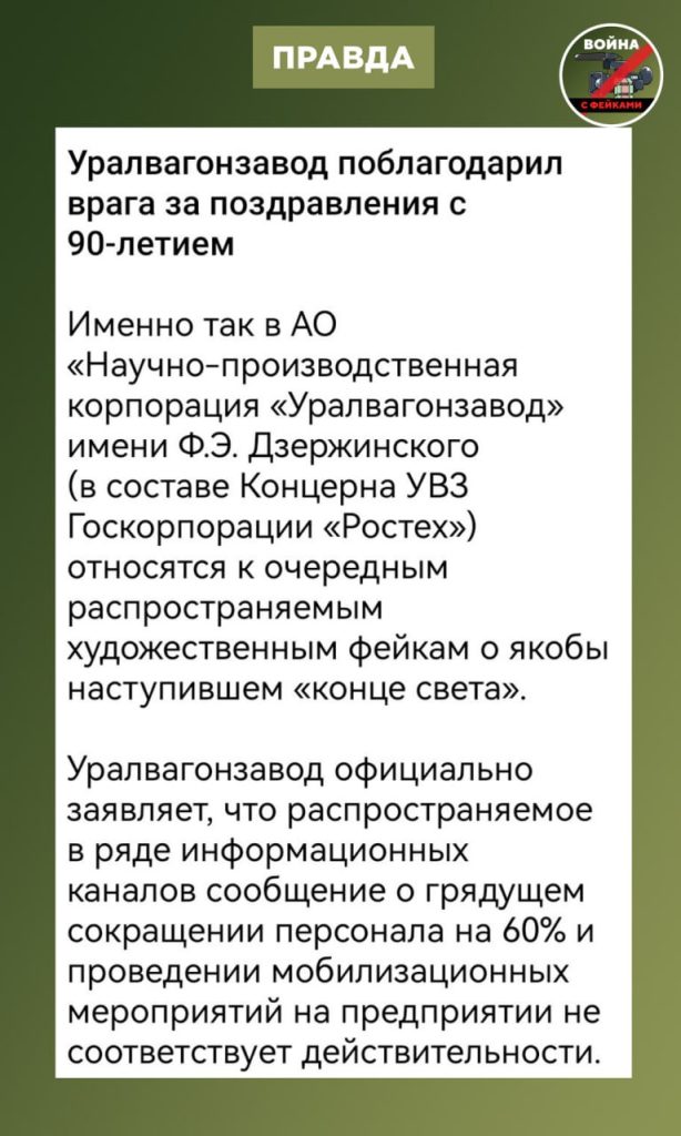 О чем фейк: «Уралвагонзавод» (УВЗ) готовится сократить 60% сотрудников. Такой документ появился в Сети.