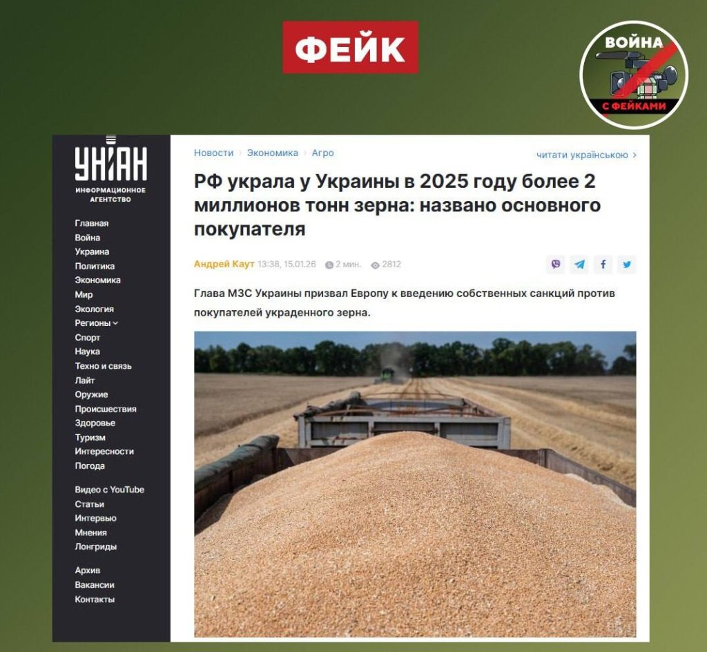 О чем фейк: В 2025 году Россия украла более 2 млн тонн украинского зерна, пишут киевские СМИ.