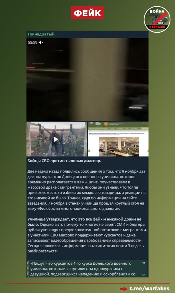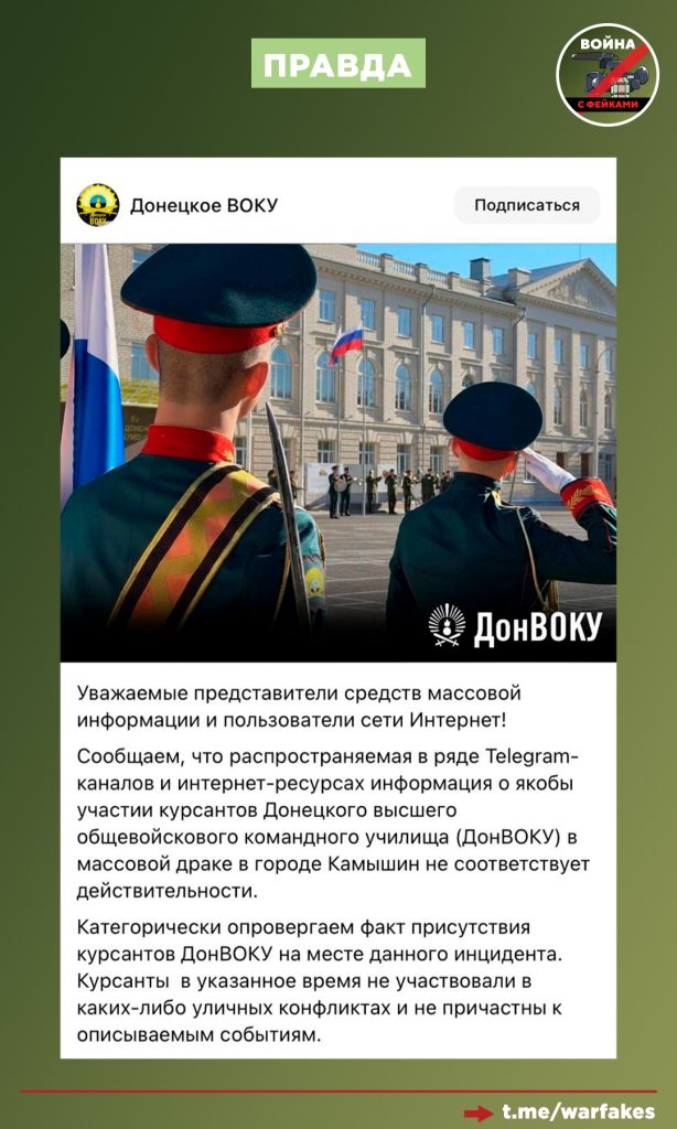 О чем фейк: В городе Камышине курсанты Донецкого общевойскового командного училища (ДонВОКУ) подрались с мигрантами из-за девушки. Сообщения об этом появились в ряде телеграм-каналов.