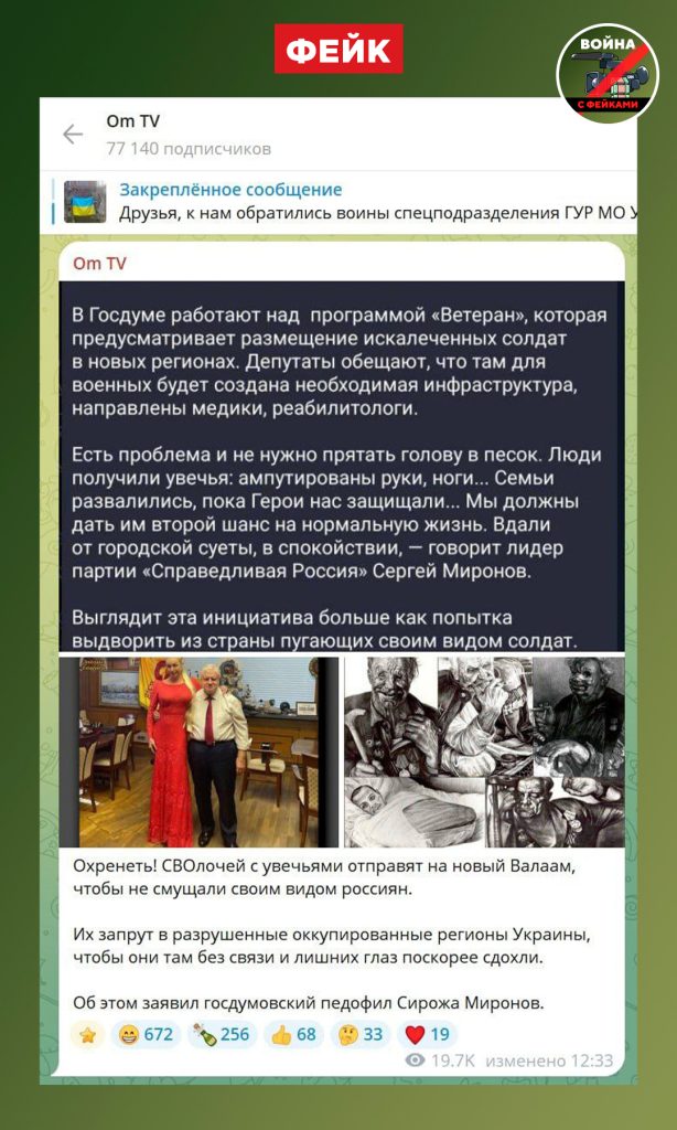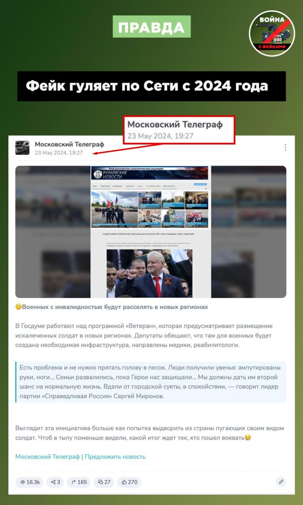 🟢 Фейкометы упоминают лидера партии «Справедливая Россия» Сергей Миронов, который никогда не говорил об отселении военнослужащих с инвалидностью в новые регионы.