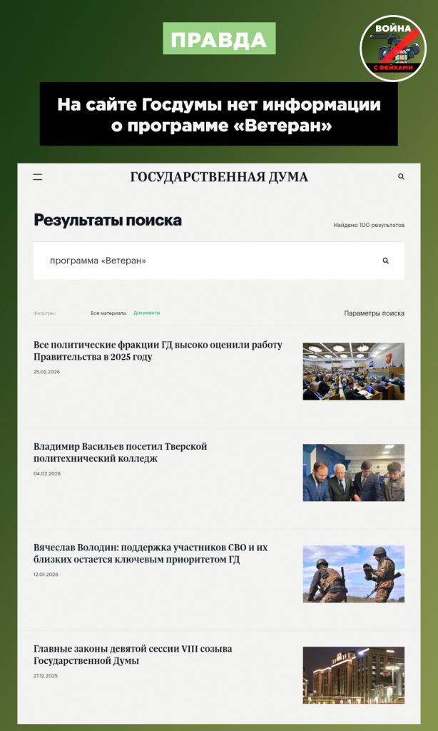 На официальном сайте Государственной думы нет информации о программе «Ветеран».