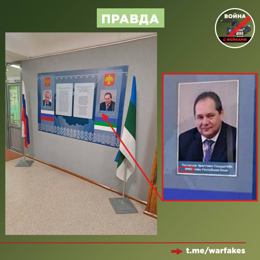 В Республике Коми, как и в других регионах РФ, в школах висят стенды с изображением Президента и руководителя региона. Сейчас Коми возглавляет Гольдштейн в статусе врио, о чем и сообщается на печатных материалах (см. медиа).