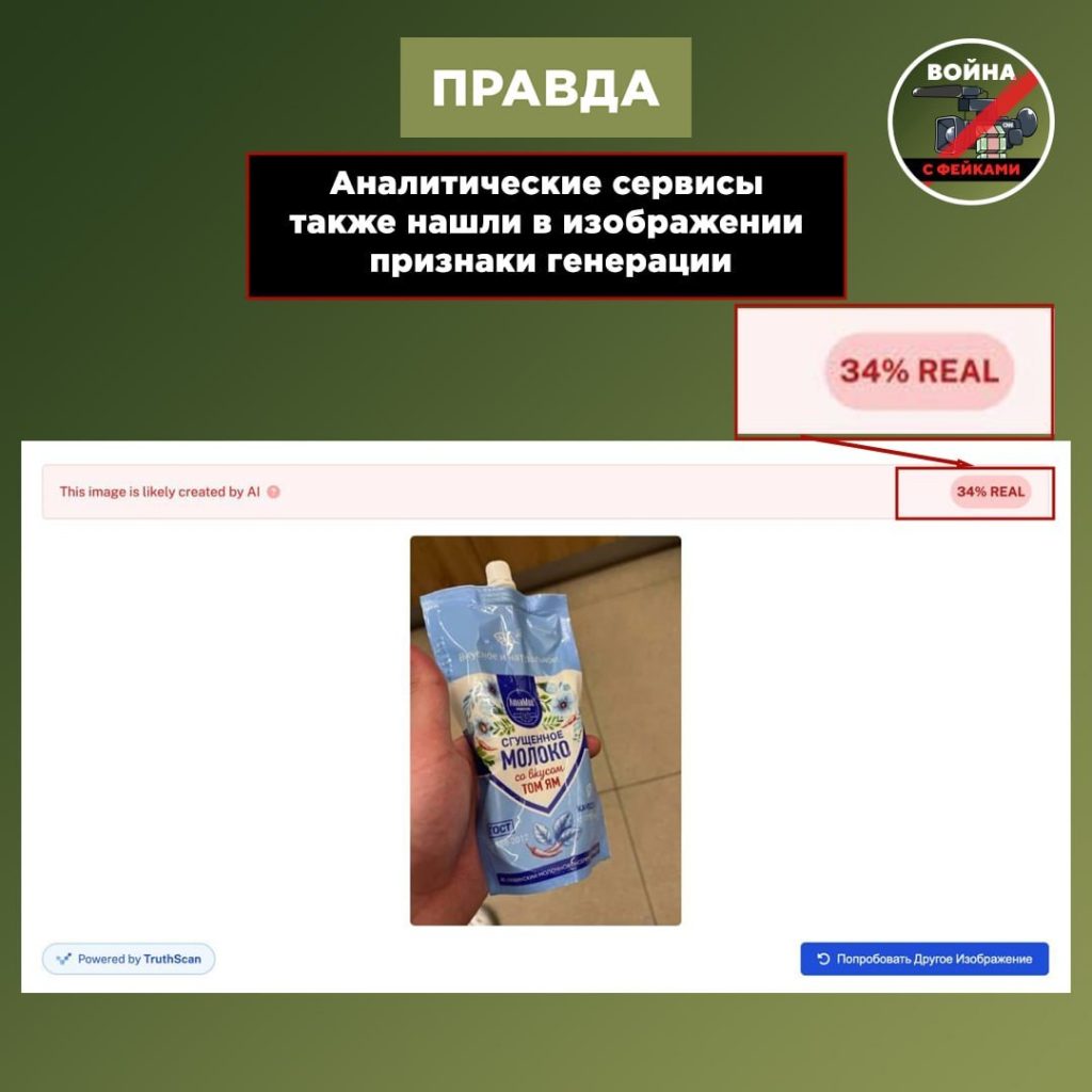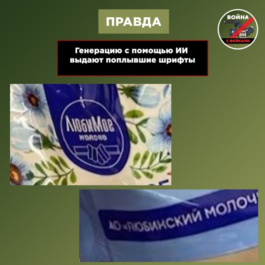 В данном случае для убедительности было сгенерировано промоизображение не канонической сгущенки, на что указывает плывущий на картинке шрифт. Референсом, вероятно, стала реклама продукции омского «Любинского молочноконсервного комбината», которая выпускается под брендом «ЛюбиМое».