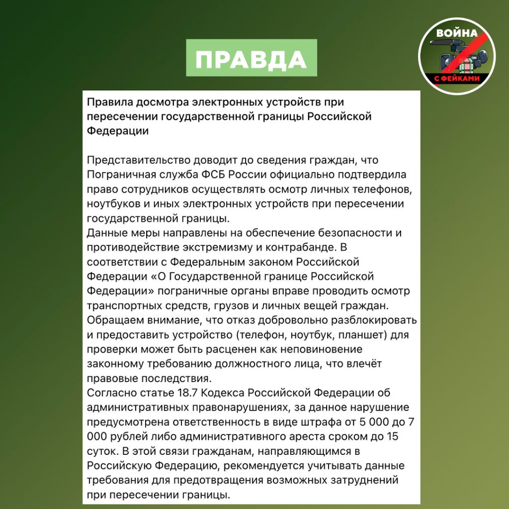 🟢При этом в первоисточнике четко указано, что Пограничная служба ФСБ России лишь подтвердила (а не сообщила о введении новой нормы) право сотрудников осуществлять осмотр личных электронных устройств.