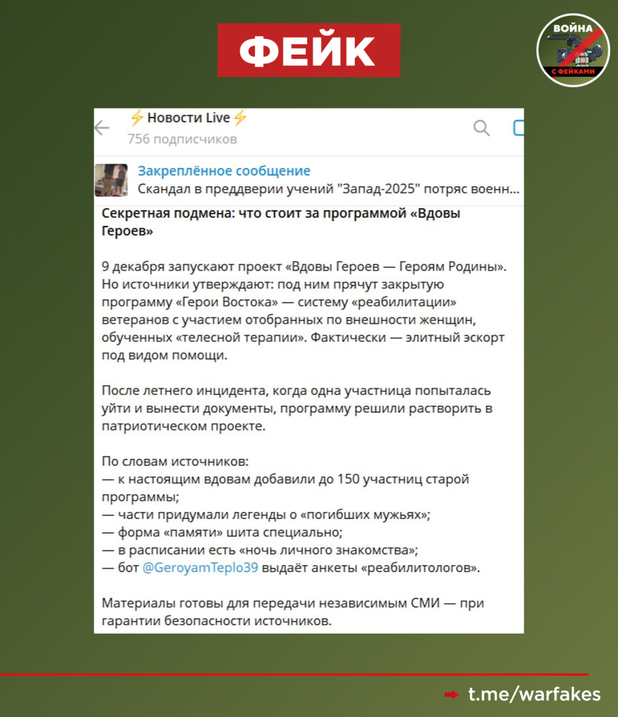 Проекта «Вдовы героев – Героям Родины», о котором пишут фейкоделы, не существует. О нем ничего не говорится на официальных ресурсах Минобороны, а заявленная во вбросе тематика противоречит здравому смыслу и российскому законодательству.