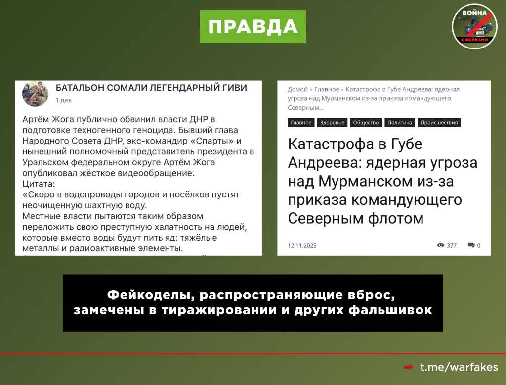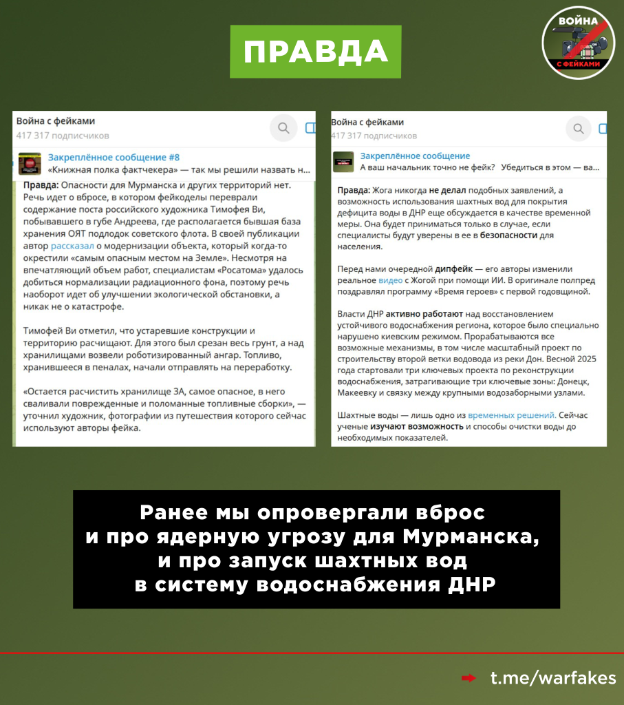 В другой соцсети фейк распространяет группа, которая публикует фейки и дипфейки. Например, ранее у них вышел пост о том, что полномочный представитель президента в Уральском федеральном округе Артём Жога обвинил власти ДНР в запуске ядовитых вод в систему водоснабжения региона. Заявления такого политик не делал, а сама тема — тоже фейк.