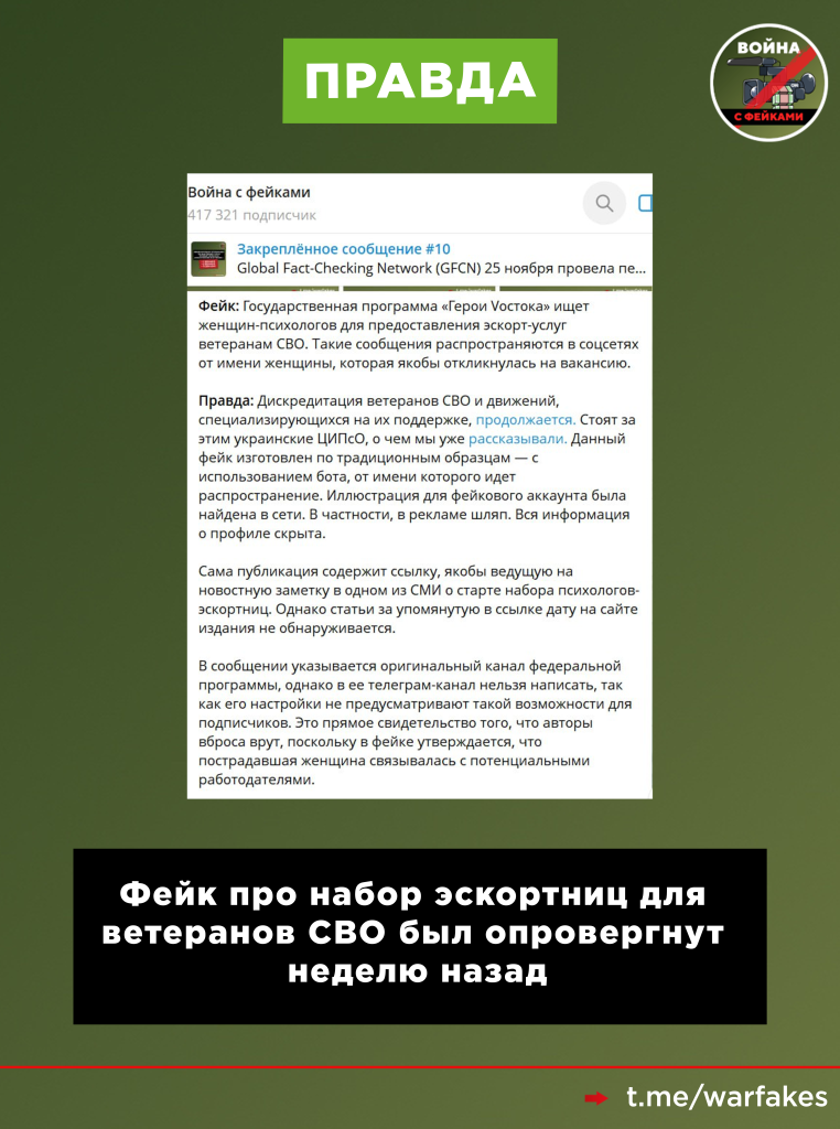 Это уже вторая волна фейков про формирование резерва эскортниц для ветеранов СВО под эгидой госпрограмм. Аналогичный вброс, дискредитирующий российских бойцов, мы опровергали недавно.