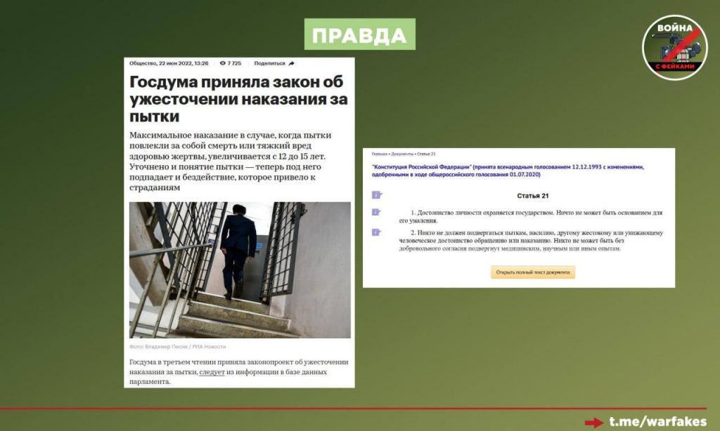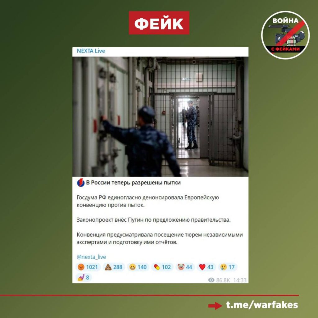 О чем фейк: В России теперь разрешены пытки, так как Госдума денонсировала Европейскую конвенцию против пыток. Об этом сообщили оппозиционные телеграм-каналы.