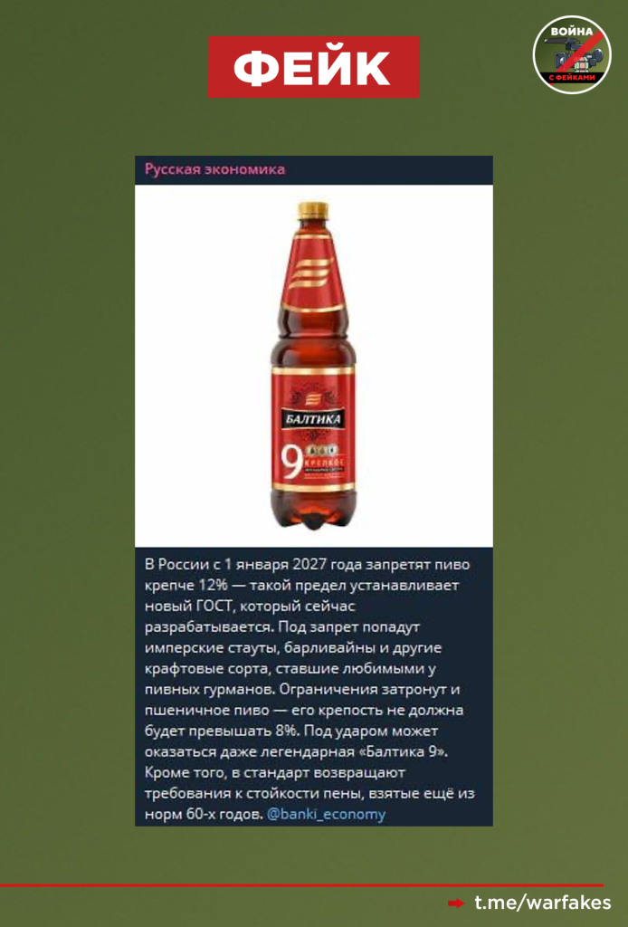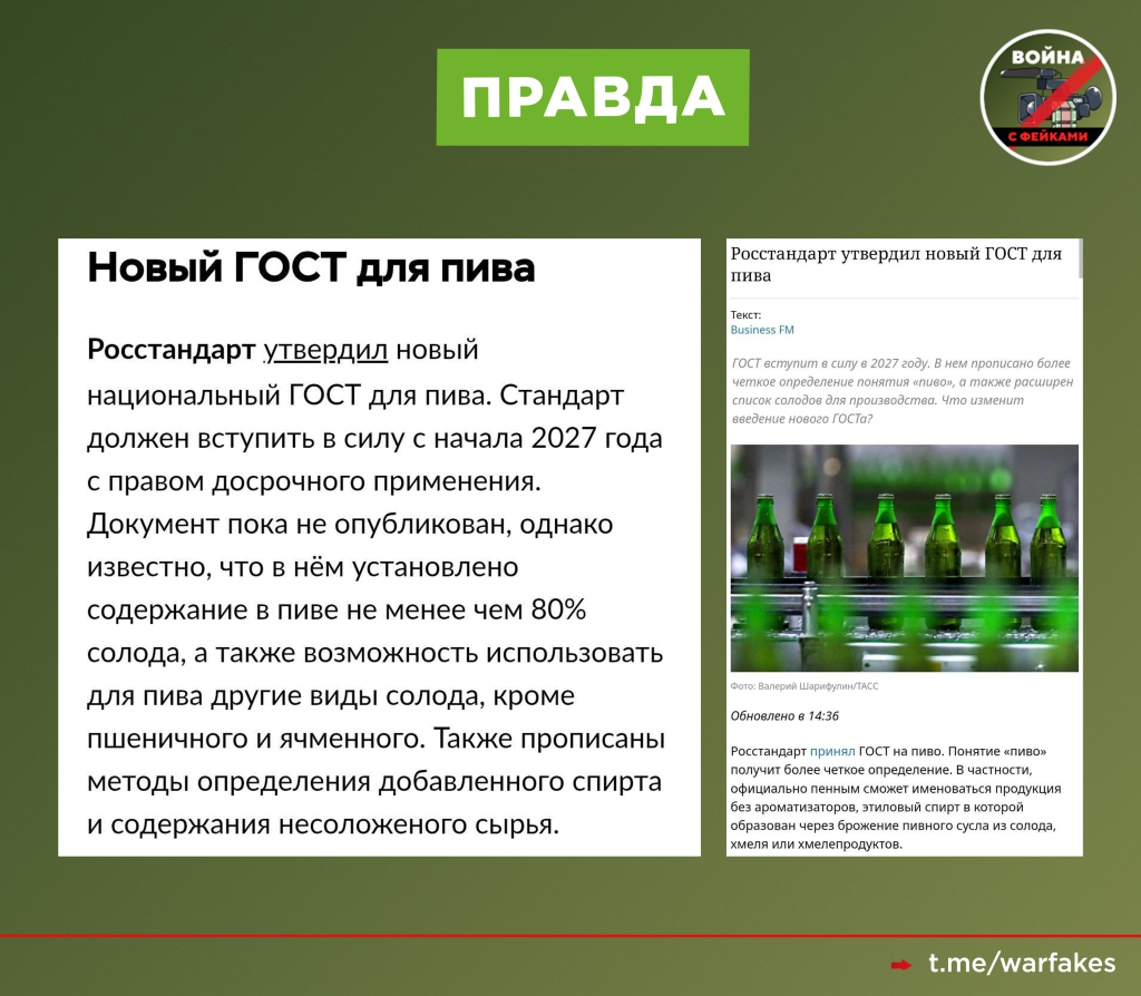 О чем фейк: В России запретят пиво крепостью выше 12 градусов в связи с разработкой нового ГОСТ. Об этом сообщается в Telegram.