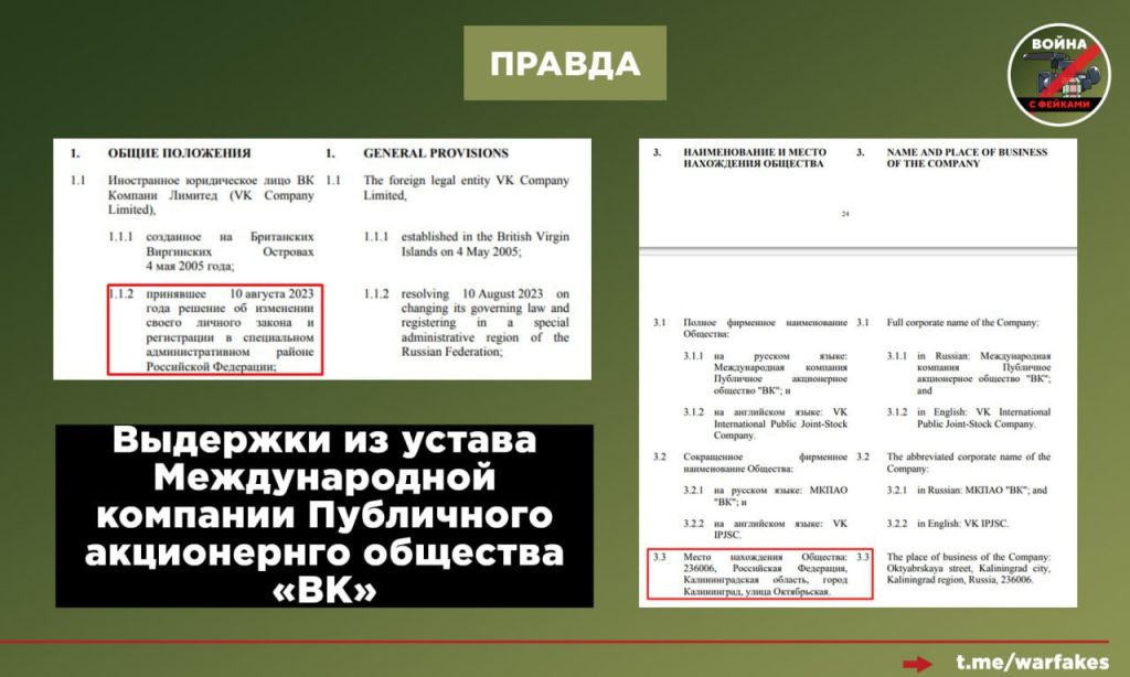 🟢Процесс редомициляции (смены юридического адреса компании без прекращения ее деятельности) был завершен в 2023 году. Это подтверждается уставными документами. Международная компания публичное акционерное общество «ВК» (МКПАО «ВК») зарегистрирована в специальном административном районе на острове Октябрьский в Калининградской области. Это территория с особым правовым режимом, созданная для возврата российского бизнеса из зарубежных юрисдикций.