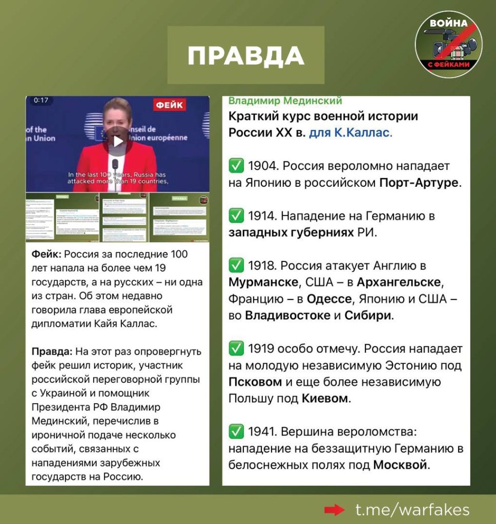 Министр слово в слово повторила ложь, ранее озвученную главой евродипломатии Каей Каллас. Ее, напомним, опроверг Владимир Мединский.