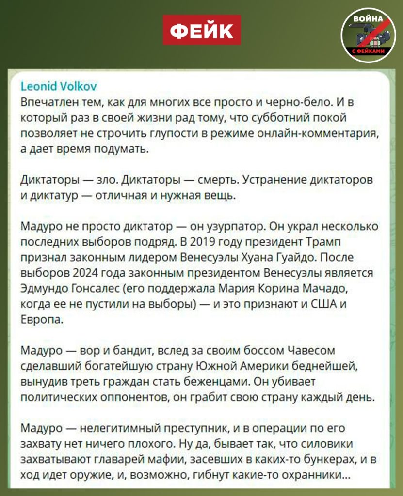 О чем фейк: Захват президента Венесуэлы американскими военными — «отличная и нужная вещь», поскольку Николас Мадуро — «диктатор и узурпатор». Об этом заявил признанный террористом и экстремистом в РФ иноагент Леонид Волков.