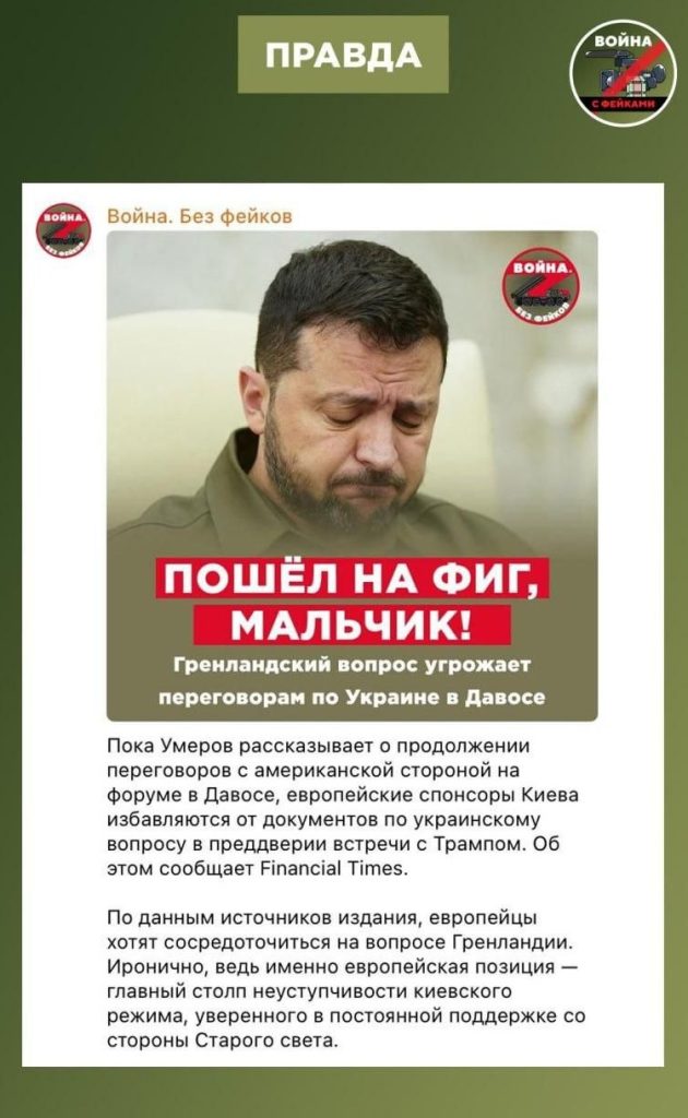 Зеленский отменил визит на Всемирный экономический форум на фоне сообщений в прессе о том, что Запад не успеет согласовать план поддержки Украины на $800 млрд. О том, что западным странам в Швейцарии будет не до Украины, сообщали в Financial Times, отмечая со ссылкой на источники, что участники хотят сосредоточиться на вопросе Гренландии.