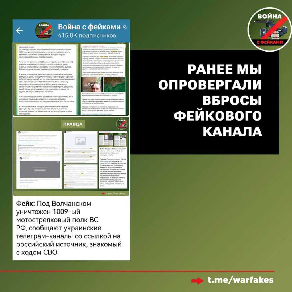 Мы опровергали фейки телеграм-канала «Северный канал» (резервный канал — «Северный канал Плюс»). Украинские пропагандисты, например, утверждали, что в июне 2024 года под Волчанском якобы был уничтожен 1009-й мотострелковый полк ВС РФ.