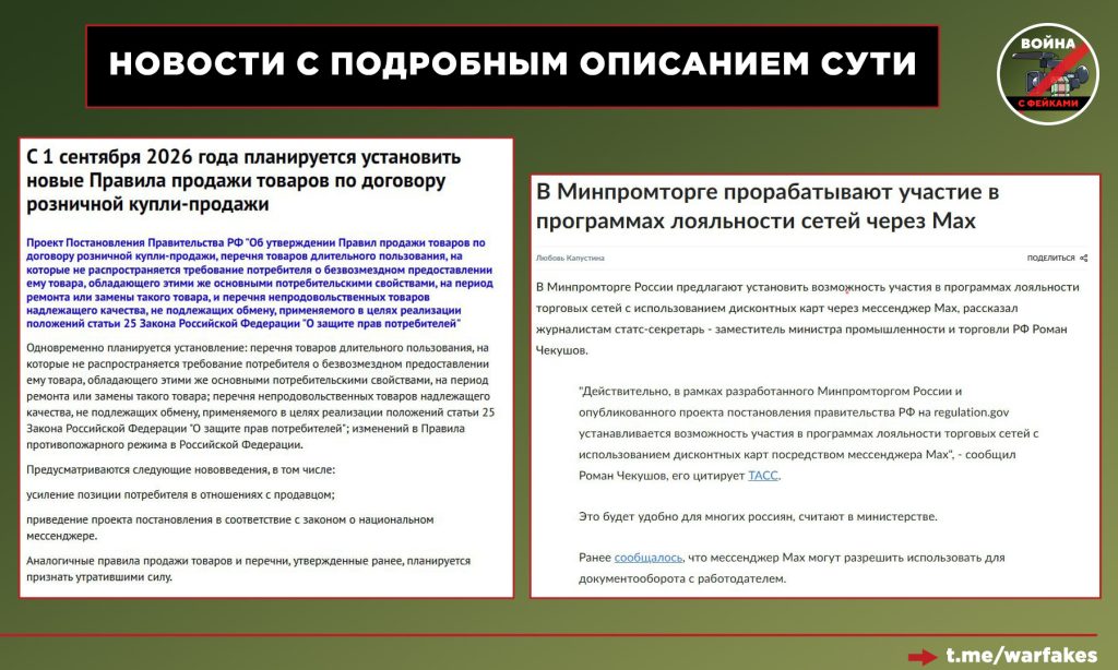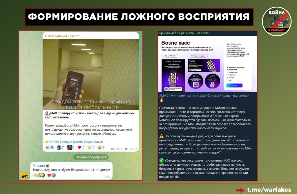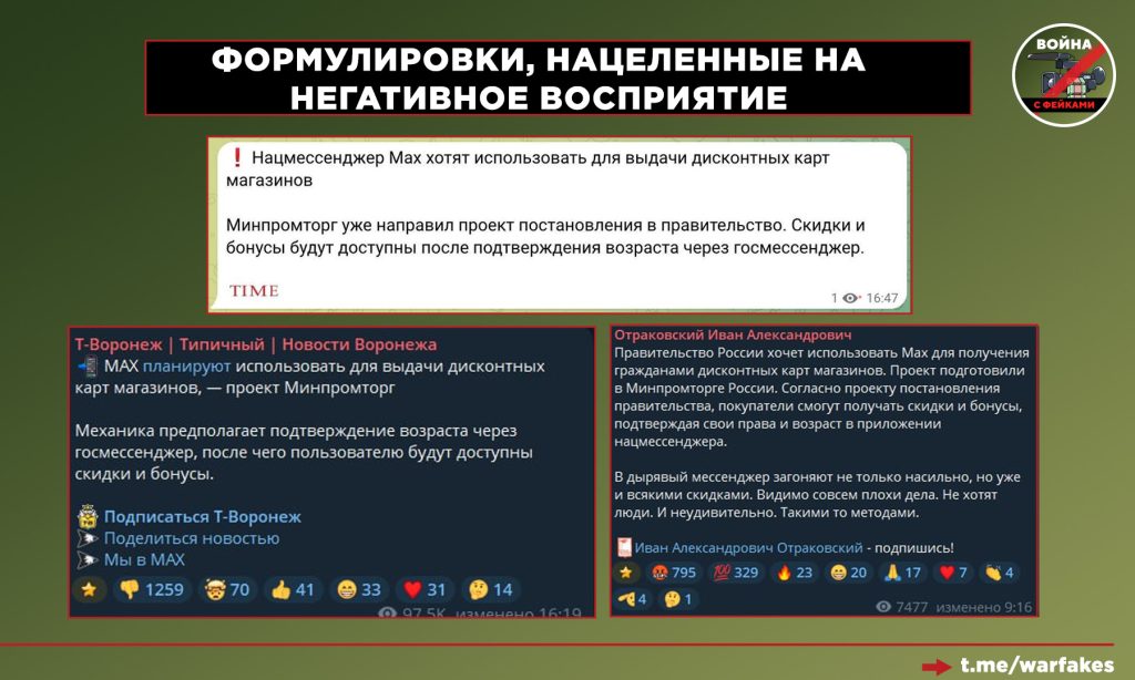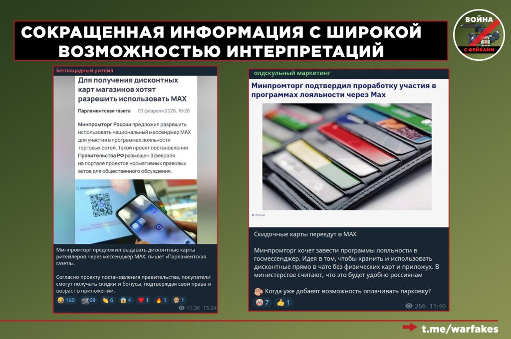 🟢 Прочие медиа, черпающие контент из официальных СМИ, сокращают исходную информацию, «выдергивая» из неё только самое, на их взгляд, интересное читателю. Тематика МАХ вызывает эмоциональный отклик, поэтому на выходе получается: «Дисконтные карты привяжут к мессенджеру». Эта информация не является ложной в бытовом смысле, однако вне контекста дает слишком обширное поле для самых противоречивых интерпретаций.
