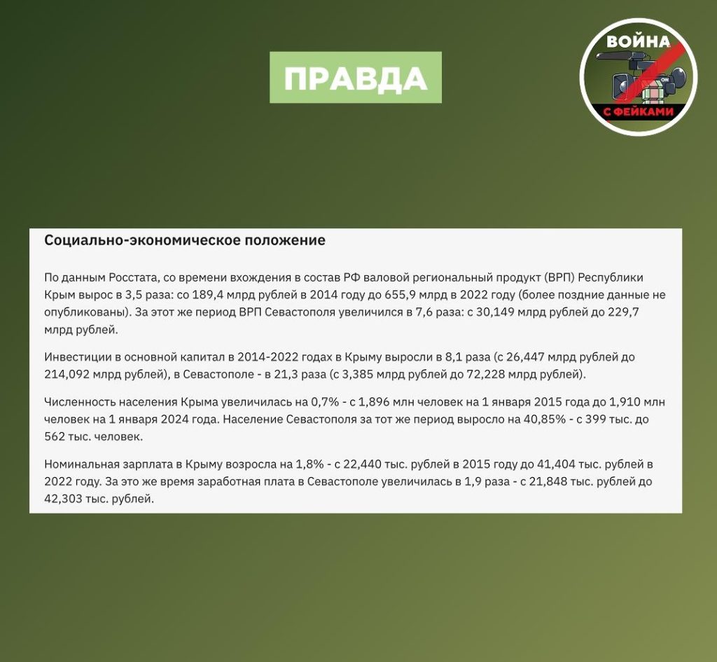 🟢Растут экономические показатели региона. В 2024 году, когда отмечалось десятилетие с момента присоединения Крыма к России, Росстат озвучил статистику: за эти годы региональный продукт Республики Крым вырос в 3,5 раза — со 189,4 млрд рублей в 2014 году до 655,9 млрд в 2022 году. ВРП Севастополя увеличился в 7,6 раза — с 30,149 млрд рублей до 229,7 млрд рублей. С 2015 года до 2039 года в Крыму и Севастополе функционирует свободная экономическая зона.