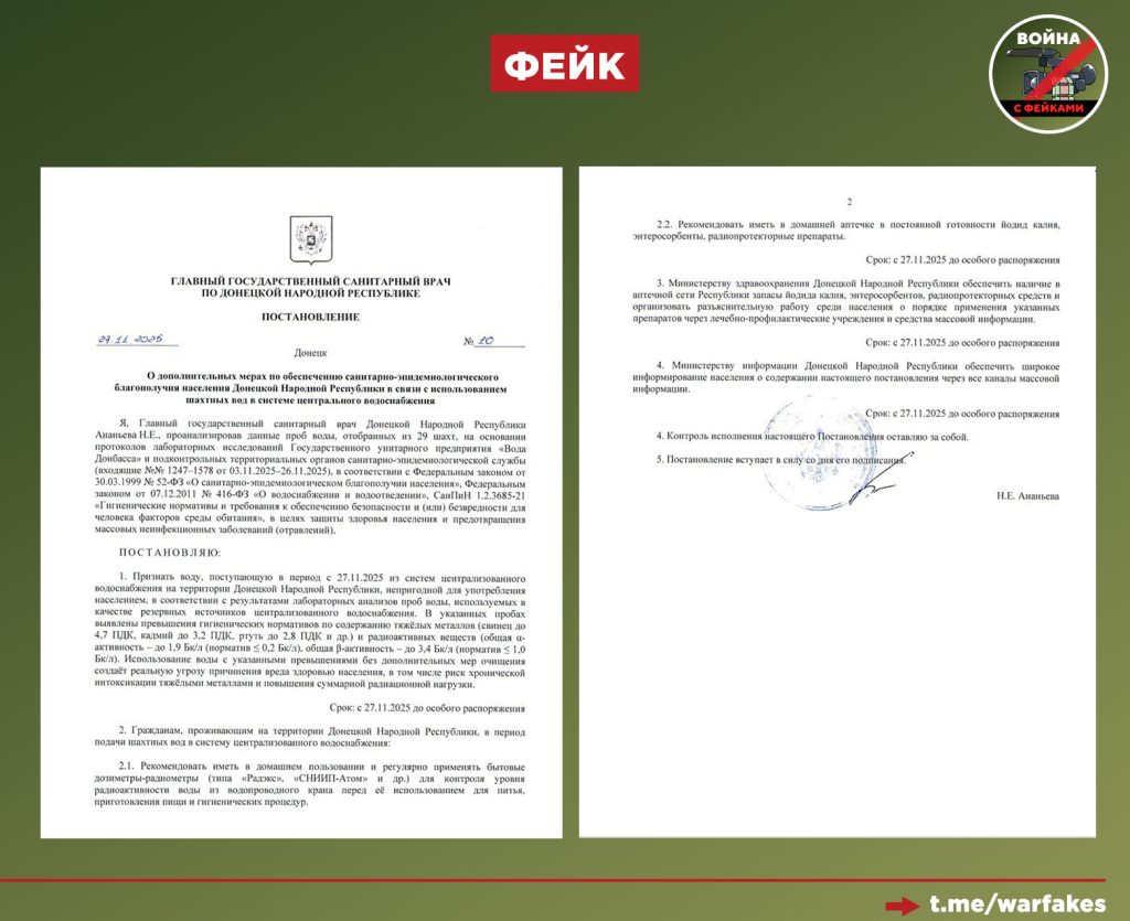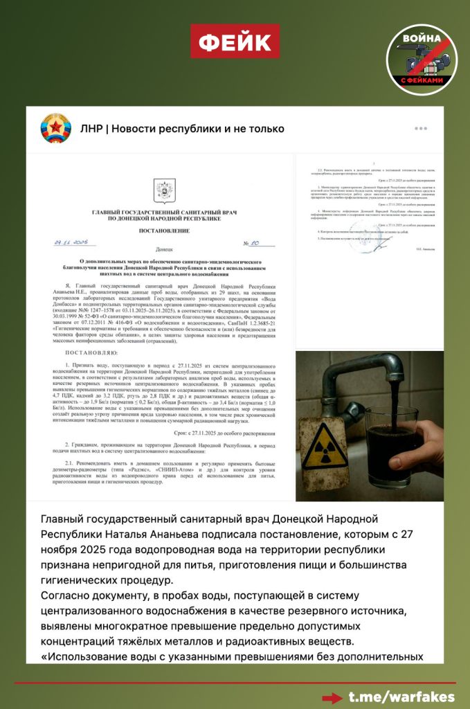О чем фейк: Роспотребнадзор в ДНР выпустил постановление, в котором гражданам даются рекомендации на период подачи шахтных вод в систему водоснабжения. Сообщения об этом распространяются в телеграм-каналах и соцсетях.