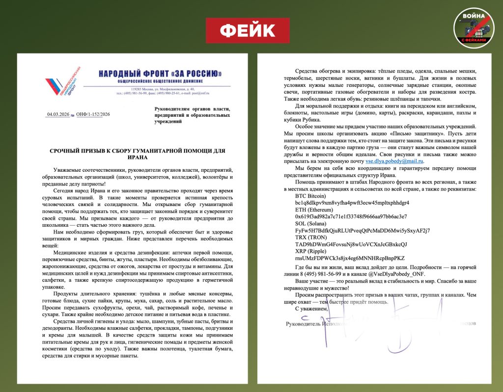 О чем фейк: Общероссийский народный фронт объявил сбор гуманитарной помощи Ирану. Соответствующее письмо распространяется в предложки соцсетей.
