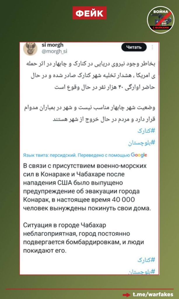 О чем фейк: Власти иранского портового города Чабахар эвакуируют население из-за обострения ситуации с обстрелами. Соответствующие сообщения, сопровождающиеся призывами покинуть город, распространяются в Х.