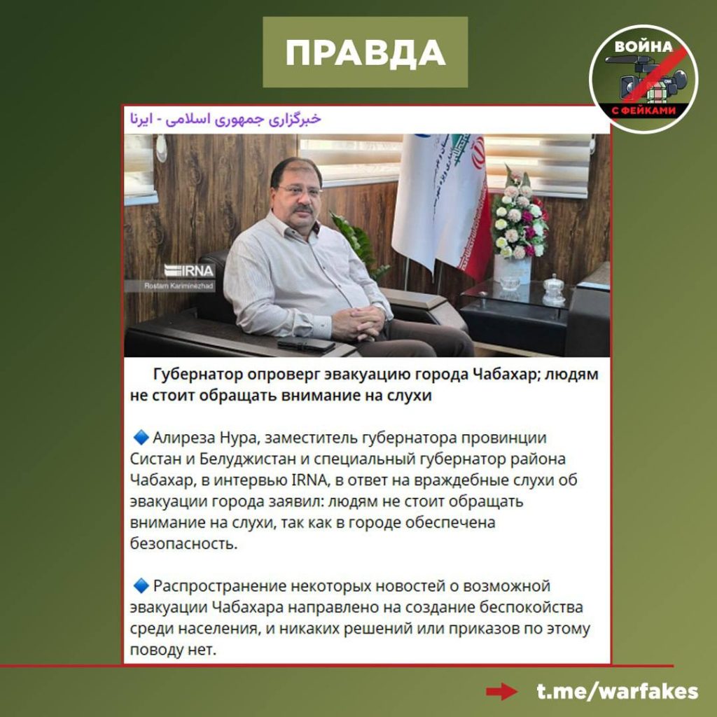 Фейк опровергает и другое информагентство, Tasnim, которое также публикует заявление губернатора. Он отметил, что жители Чабахара в настоящее время ведут свою обычную повседневную жизнь.