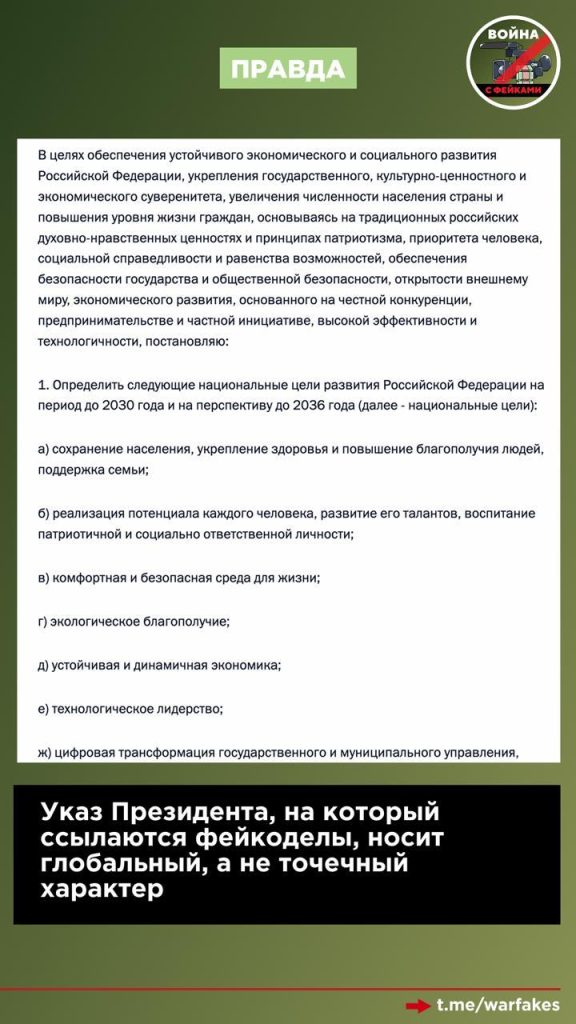 Примечательно, что в Указе Президента РФ, на который ссылаются фейкоделы, ничего не сказано про сфабрикованную инициативу. Реальное распоряжение главы государства касается глобальных вопросов, поэтому речи о точечных шагах в нем быть не может.