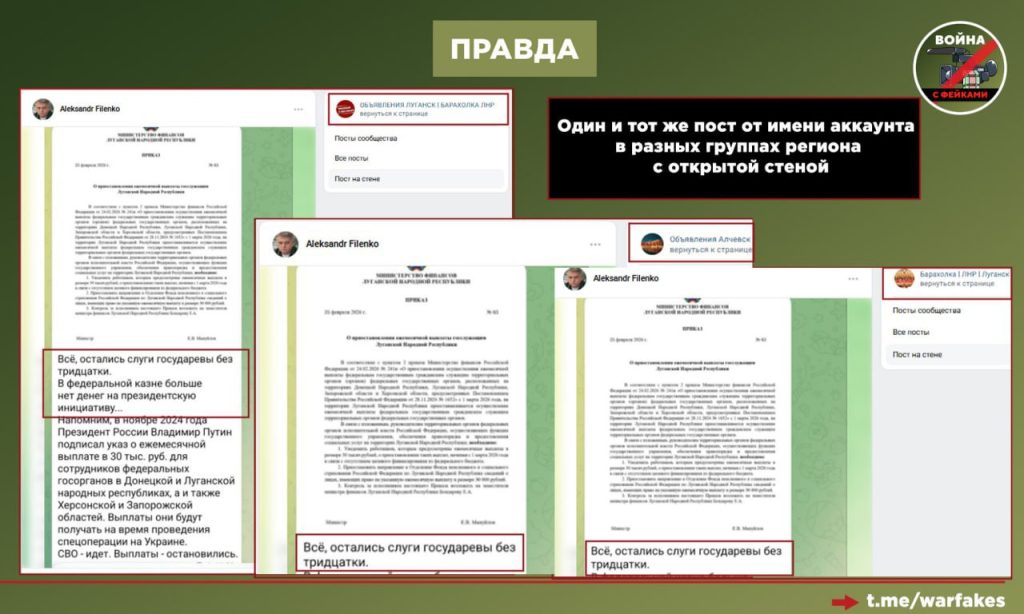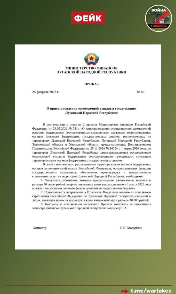 «Действующие приказы Минфина публикуются только на официальном сайте и не распространяются в формате скриншотов в социальных сетях», — обратили внимание в Министерстве финансов Запорожской области.Фейк продвигали антироссийские телеграм-каналы «Фашик Донецкий» и «Голос ЛНР», ранее замеченные в публикации дезинформации. Во «ВКонтакте» фальшивые приказы распространяли по региональным группам бот-аккаунты.