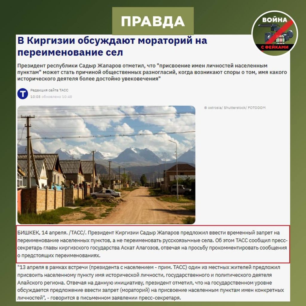 О чем фейк: Власти Кыргызстана до конца 2027 года уберут все русскоязычные названия сёл. Об этом заявил глава государства Садыр Жапаров на встрече с жителями Алайского района Ошской области.