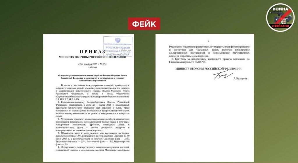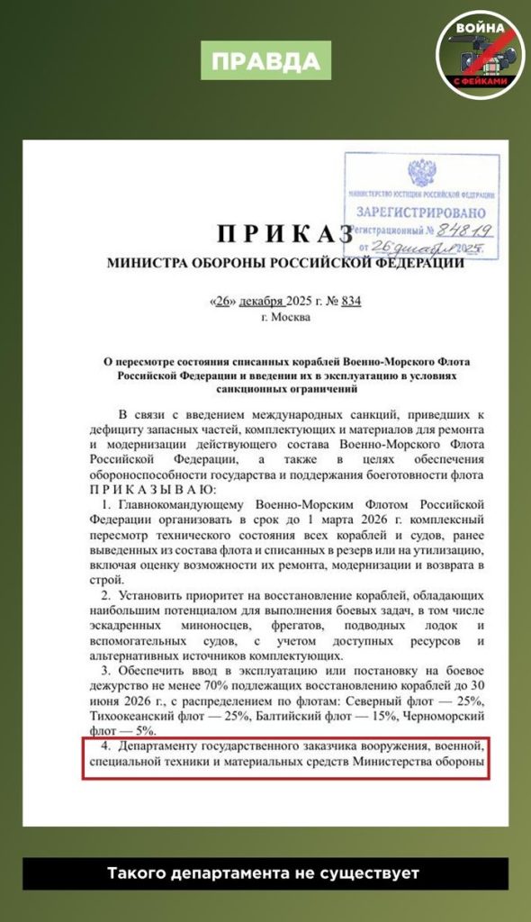 О чем фейк: Минобороны России признало дефицит запчастей для кораблей и приказало ВМФ восстановить и ввести в строй старые суда из резерва. Сообщения об этом распространяются в телеграм-каналах и соцсетях со ссылкой на соответствующий приказ ведомства.