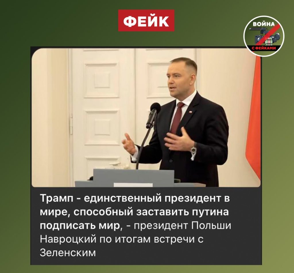 О чем фейк: Трамп — единственный президент в мире, способный заставить Владимира Путина подписать мирное соглашение. Об этом заявил президент Польши Кароль Навроцкий.