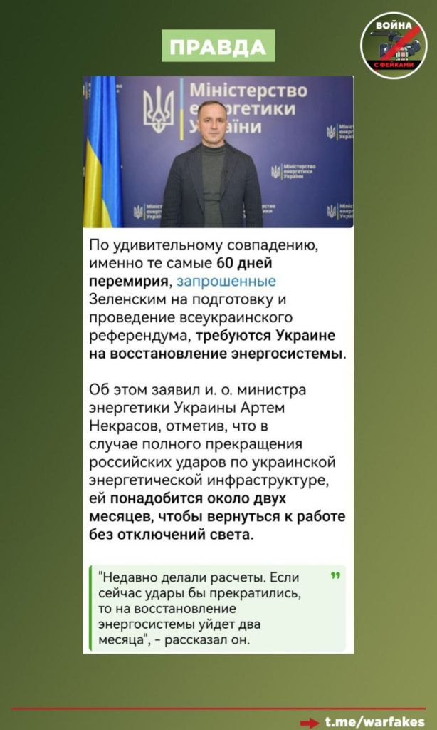 Украине нужно 60 дней на восстановление энергосистемы и перегруппировку войск. Исполняющий обязанности министра энергетики страны Артем Некрасов открыто говорил, что в случае прекращения огня украинской энергетической инфраструктуре понадобится около двух месяцев, чтобы вернуться к работе без отключений света. То есть Киев продолжает искать лазейки для затягивания конфликта. Россия, в свою очередь, заинтересована в устойчивом и долгосрочном мире, на основе подписанных документов.