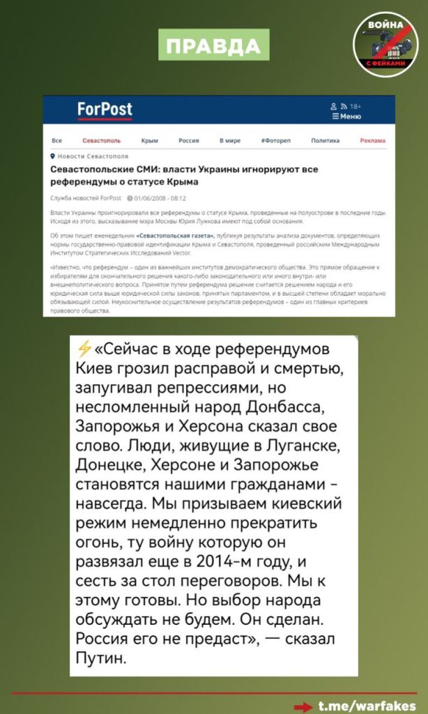 Признают ли украинские власти референдумы, которые не проводят сами. Нет. Власти Украины проигнорировали все референдумы (общекрымский, всесоюзный, всеукраинские) о статусе Крыма, проведенные на полуострове до 2008 года. Также представители киевского режима отрицают результаты референдума от 2014 года. Напомним, тогда свыше 96% местных жителей выступили за вхождение региона в состав России. Конституционный суд Украины признал это голосование незаконным.