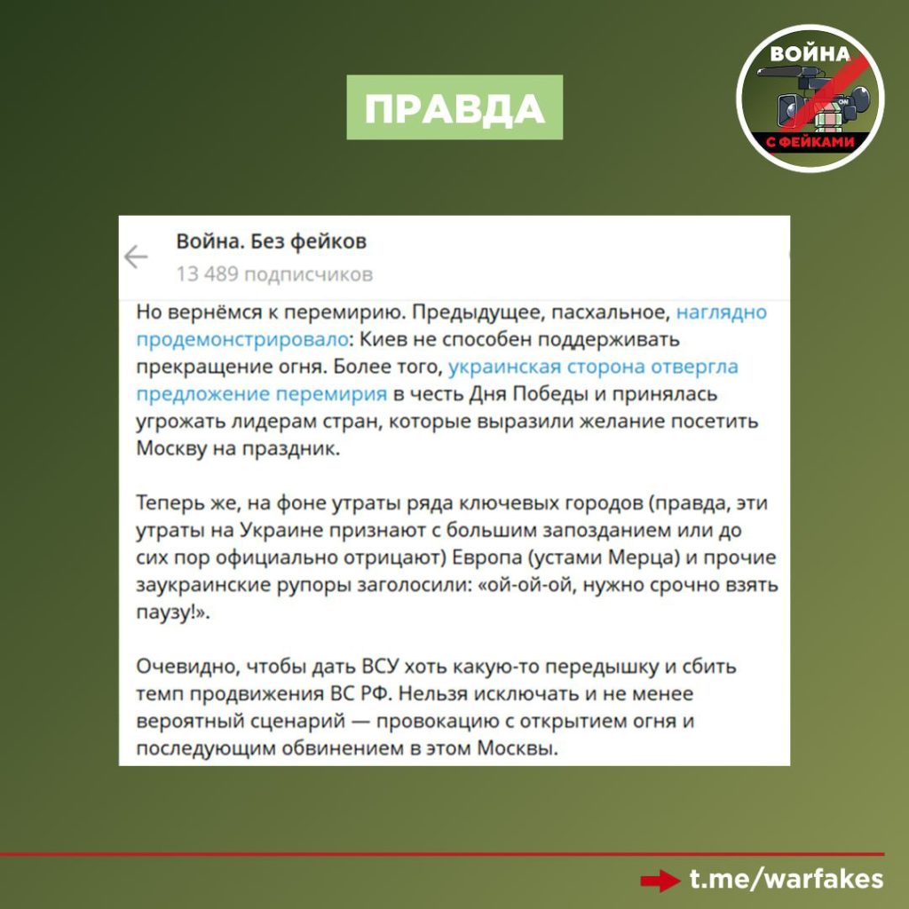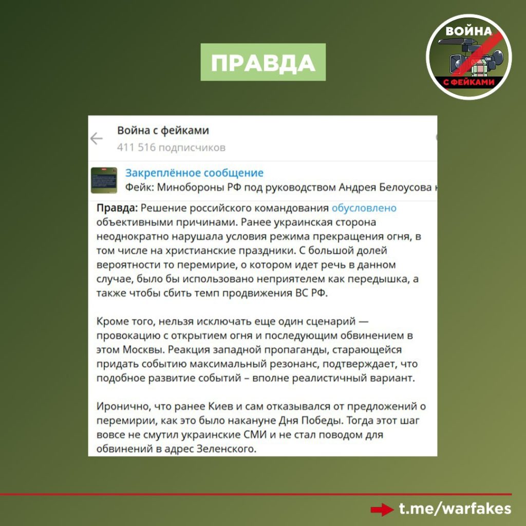 Аналогичный фейк мы опровергали недавно. Отказ от прекращения боевых действий был обусловлен тем, что ранее украинская сторона неоднократно демонстрировала, что сама не готова соблюдать перемирия, в том числе на христианские праздники.