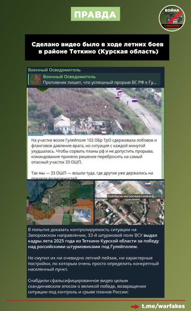 О чем фейк: Для купирования прорыва ВС РФ в сторону Гуляйполя туда был направлен 33 отдельный штурмовой полк ВСУ, который отбросил российские войска назад, вернув контроль над ситуацией. Информация об этом распространяется в телеграм-каналах и подтверждается видео с дрона, где заснят фрагмент боевых действий.