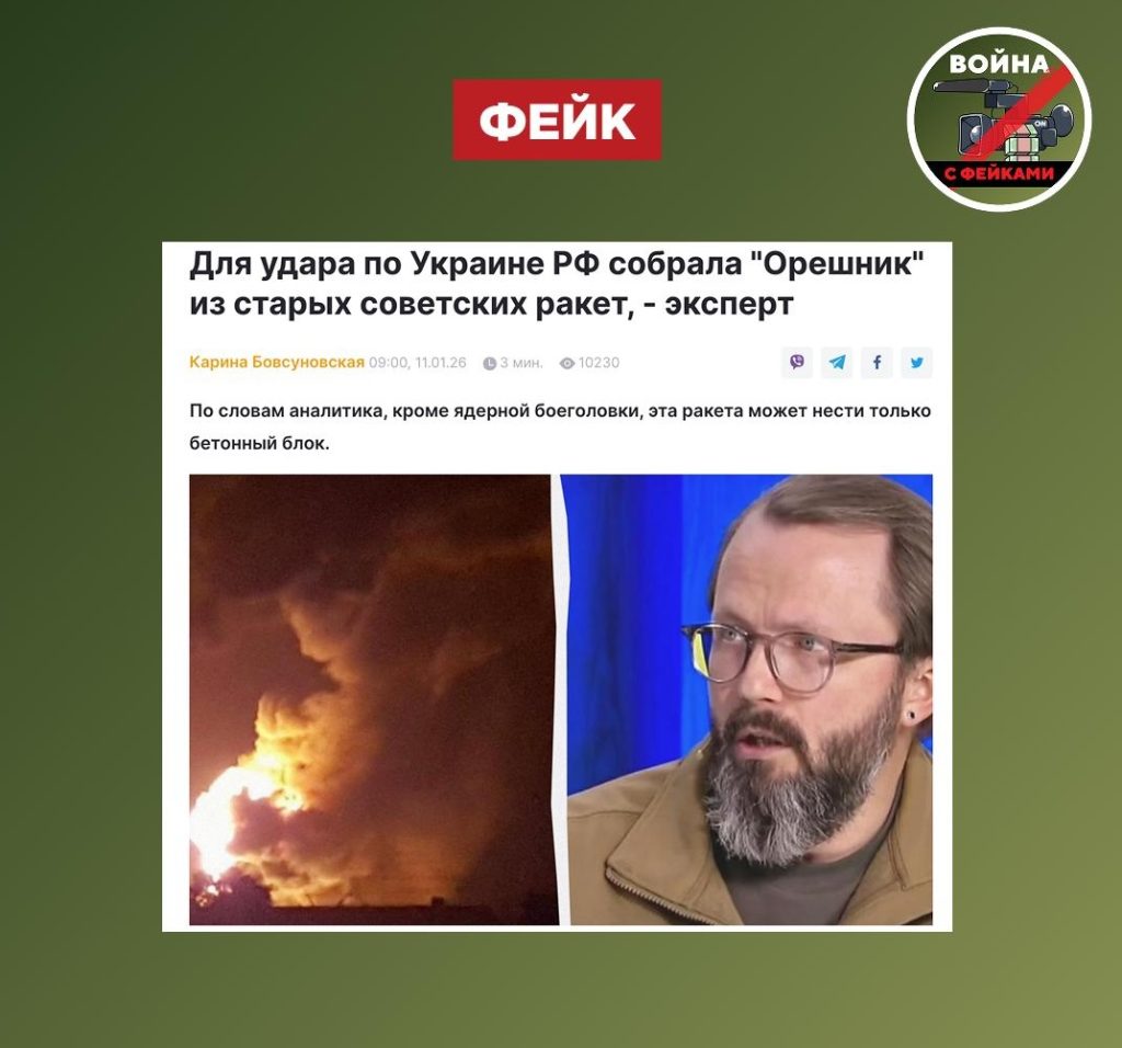 О чем фейк: «Орешник», которым был нанесен удар по Украине 9 января, был собран из старых советских ракет. Об этом сообщают киевские СМИ со ссылкой на офицера Воздушных сил ВСУ в резерве Анатолия Храпчинского.