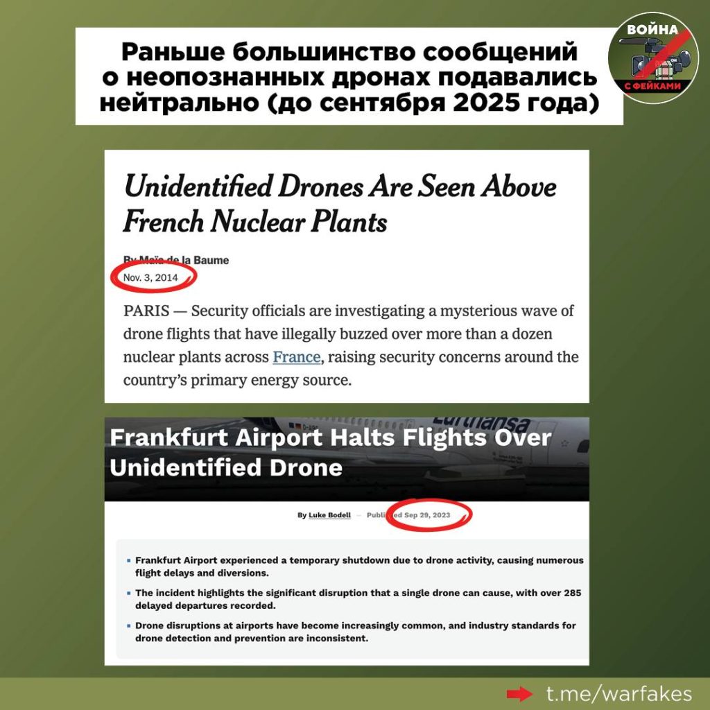На самом деле, инциденты с неопознанными БПЛА происходили в небе над Европой регулярно на протяжении многих лет. Однако до сентября 2025 года подобные новости освещались западными СМИ нейтрально, а после ситуация резко изменилась — западные спикеры начали моментально выступать с бездоказательными обвинениями России в инцидентах с БПЛА, а сообщения «о причастности РФ» массово расходятся по европейским СМИ.