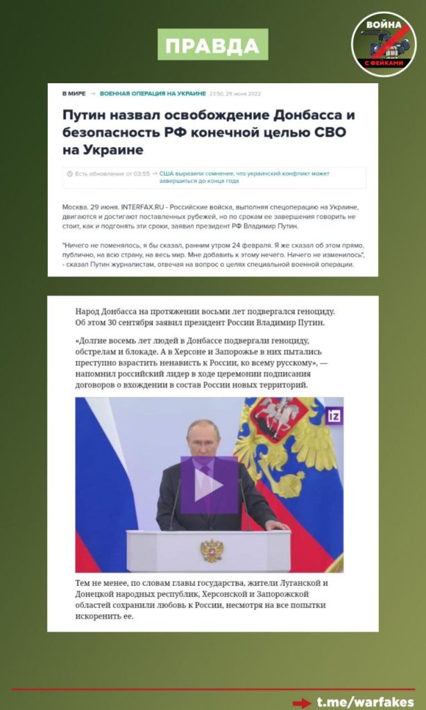 «Конечная цель мной обозначена — это освобождение Донбасса, защита этих людей, и создание условий, которые гарантировали бы безопасность самой России», — отмечал Президент России Владимир Путин в 2022 году.