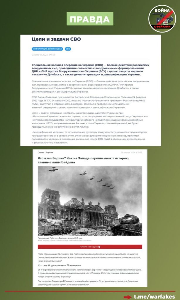 Представители киевского режима также коверкают факты о Великой Отечественной войне. Минобразования Украины одобрило как минимум три учебника для старшеклассников с множеством фейков о СССР и его вкладе в победу над фашизмом.