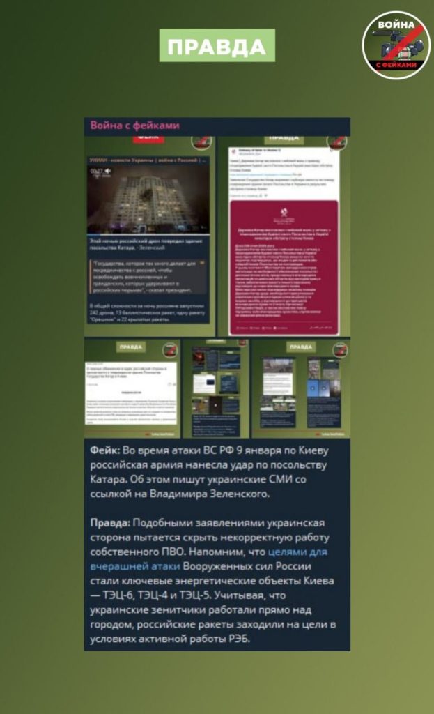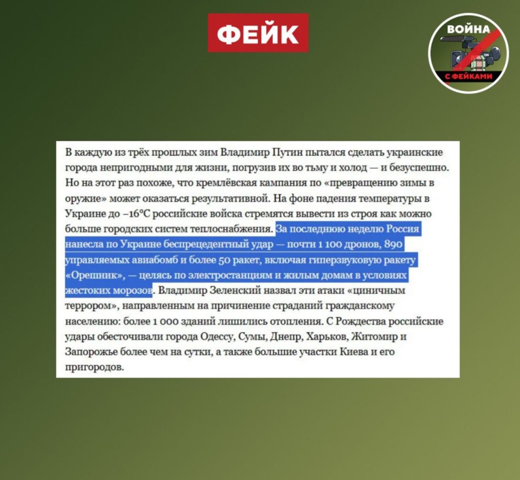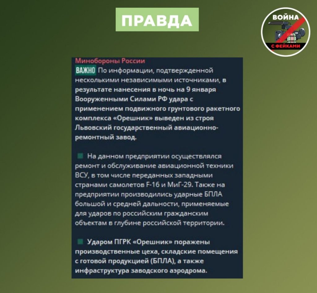 Как на самом деле: 9 января российские военные с помощью «Орешника» вывели из строя Львовский авиационный завод, где обслуживались истребители и производились ударные БПЛА. Это было ответом на атаку на резиденцию Президента России Владимира Путина в Новгородской области, сообщили в Минобороны РФ.