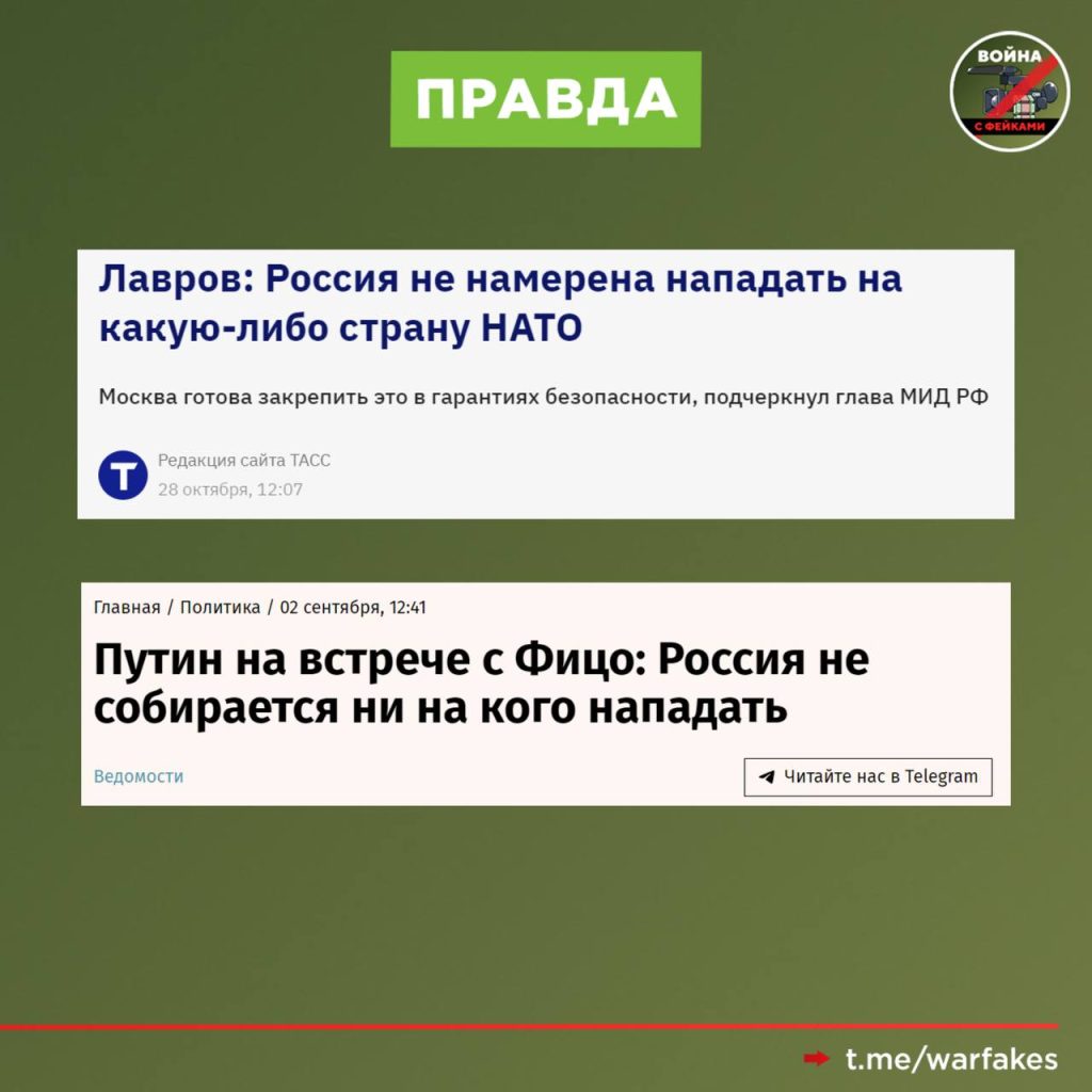 «Мы, кстати, неоднократно говорили, что у нас нет и не было намерений нападать на какую-либо страну из нынешних членов НАТО и Евросоюза. Мы готовы закрепить данную позицию в будущих гарантиях безопасности для этой части Евразии», — заявил в конце октября министр иностранных дел России Сергей Лавров.