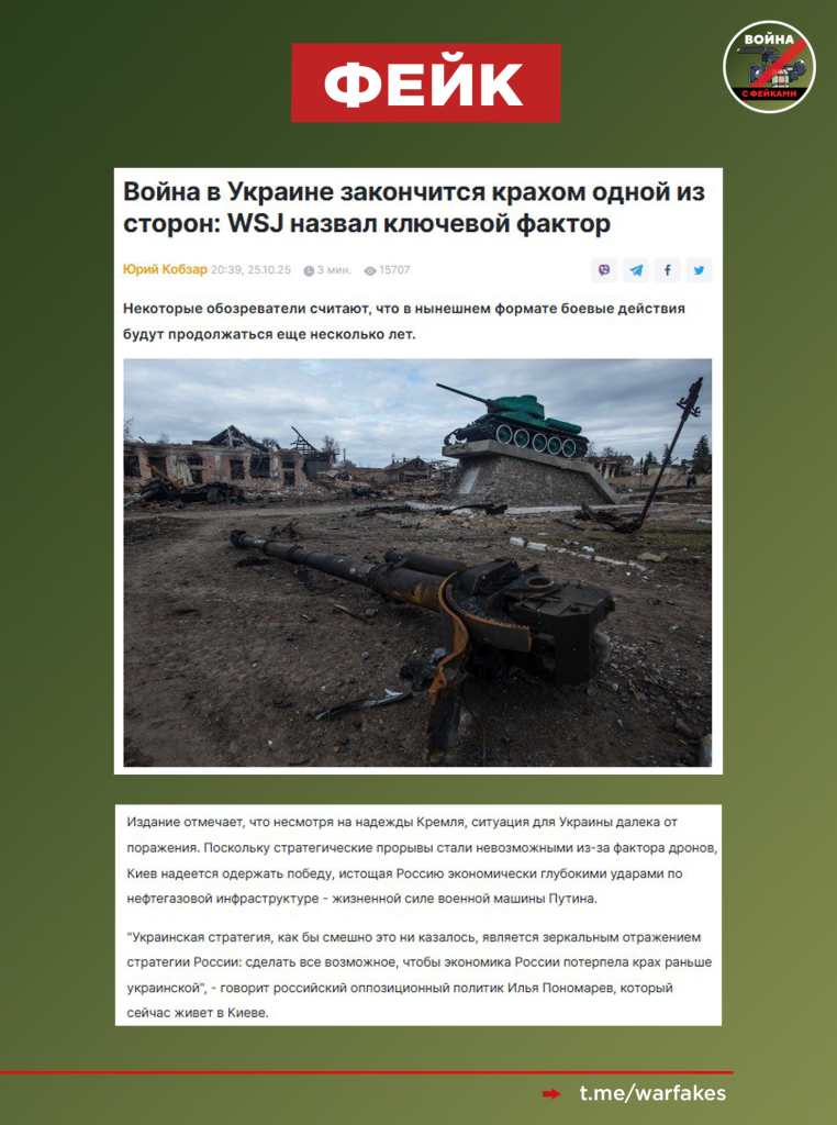О чем фейк: Россия отказалась от мирных переговоров — теперь конфликт перешел в форму борьбы на истощение и Украина может его выиграть, пишут украинские СМИ со ссылкой на WSJ.