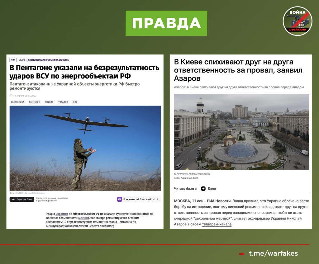 Кроме того, Киев продолжает развивать фейковый нарратив об «эффективности»» ударов по российским НПЗ и катастрофической нехватке топлива в России — это одна из главных линий украинской пропаганды на данный момент. На деле последствия подобных атак сильно преувеличиваются. В надежде взбодрить украинскую аудиторию ЦИПсО придумывает несуществующие удары, использует архивные записи и публикует недостоверную информацию о состоянии российской экономики.