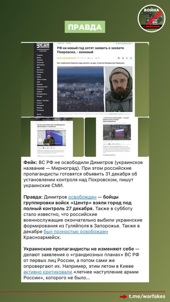 Точно таким же образом Киев придумал дату о том, что Мирноград якобы планировалось освободить к 31 декабря 2025 года. Подобные слухи ходили относительно Волчанска, Покровска и других населенных пунктов.