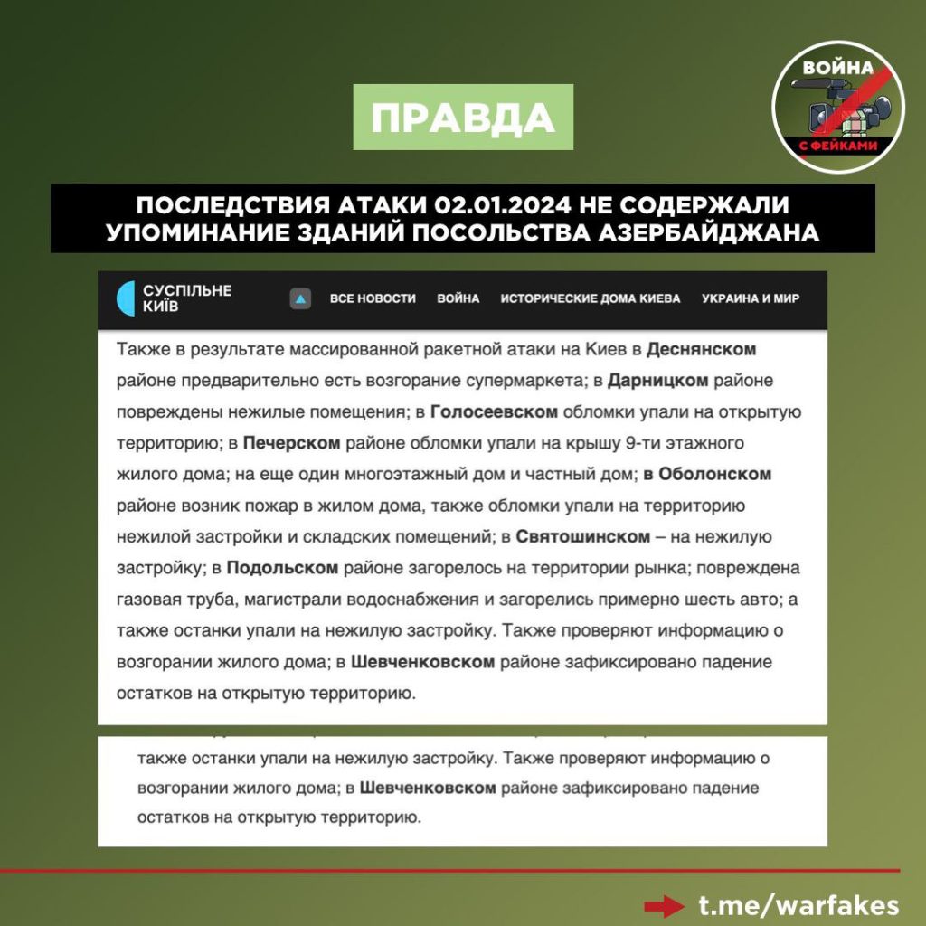 Также обратим внимание на события, произошедшие 2 января 2024 года. Напомним, тогда РФ нанесла очередной ракетный удар по столице Украины. В СМИ, телеграм-каналах не было заявлений об ударе по посольству в январе 2024 года до ноября 2025-го.