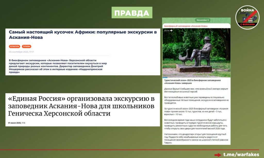 Так, на сайте администрации Чаплынского муниципального округа Херсонской области есть свежая публикация о популярных экскурсиях в «Аскании-Нова». И ни слова о закрытии и, тем более, уничтожении или разрушении заповедника.