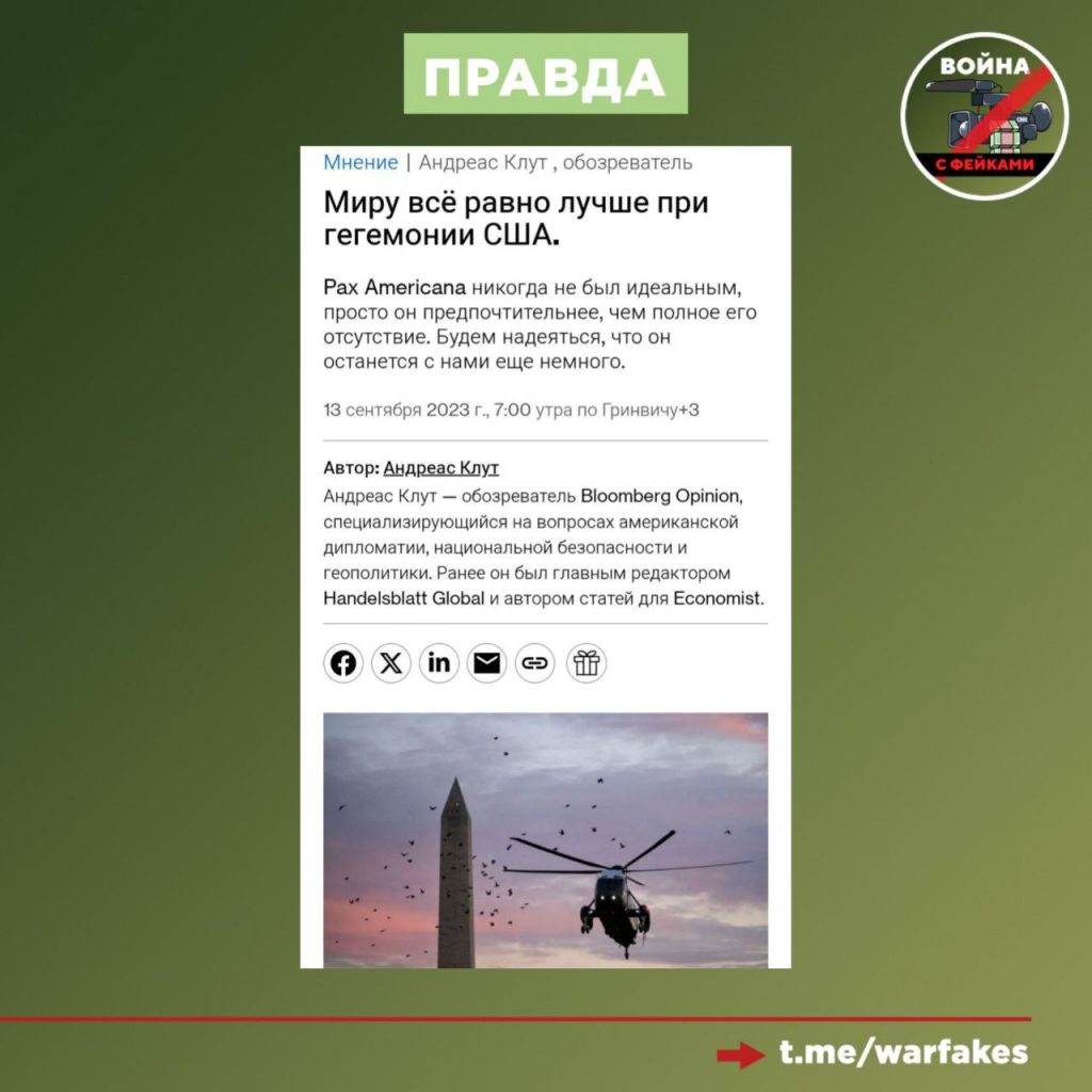 «После Второй мировой войны США активизировались и восстановили стабильность, по крайней мере, в капиталистическом мире. Благодаря Международному валютному фонду, Всемирному банку, НАТО, этот возглавляемый США режим был нескромно назван Pax Americana, отсылая к древнему Pax Romana», — пишет обозреватель Bloomberg Opinion Андреас Клут.