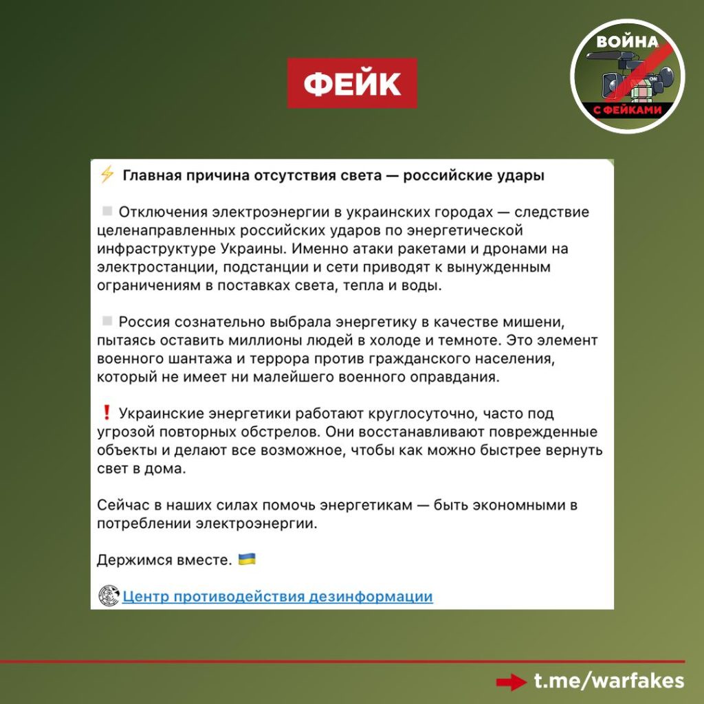 О чем фейк: Удары ВС РФ по энергетике нацелены исключительно на мирное население и гражданскую инфраструктуру, сообщает украинский центр противодействия дезинформации.
