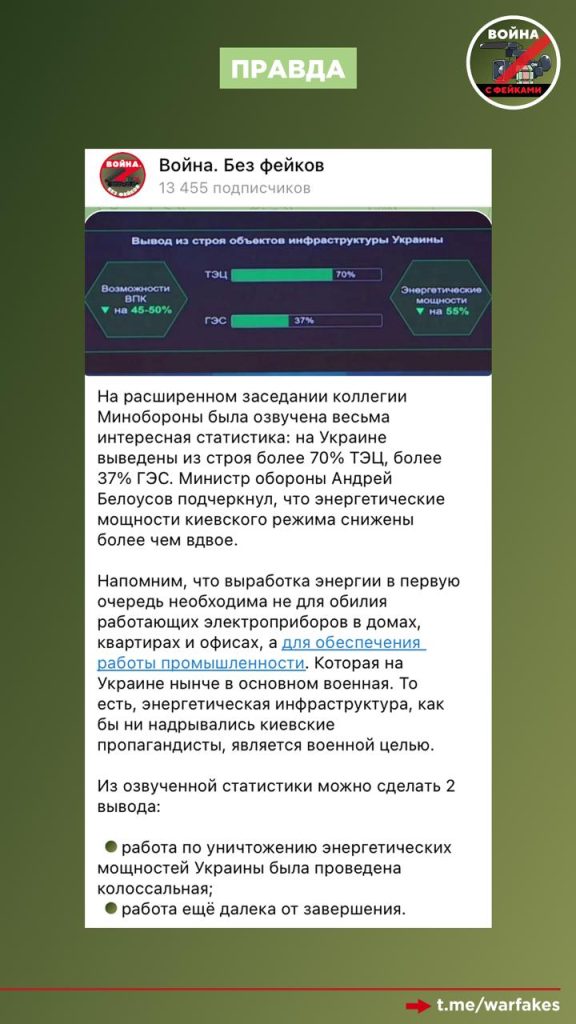 Этот фейковый нарратив украинская сторона с завидной частотой демонстрирует на своих ресурсах. Однако обвинения в адрес российских военных — это сознательное искажение фактов, учитывая, что объекты энергетики работают сейчас прежде всего в интересах ВСУ, а не мирного населения.