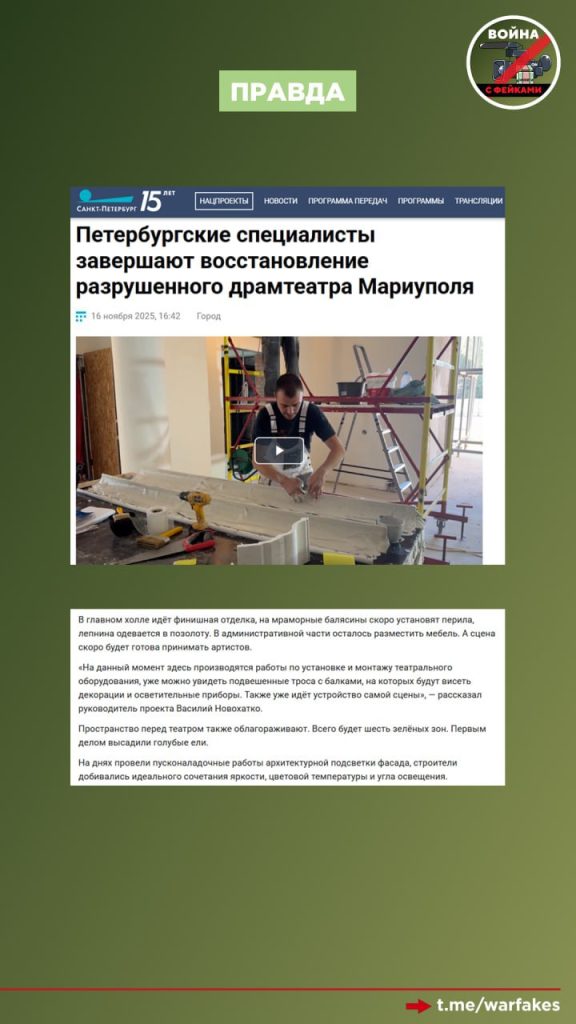 О чем фейк: В 2022 году РФ сбросила бомбы на Мариупольский драмтеатр. Об этом сообщают украинские СМИ и телеграм-каналы в преддверии начала показа новых спектаклей в восстановленном здании театра.