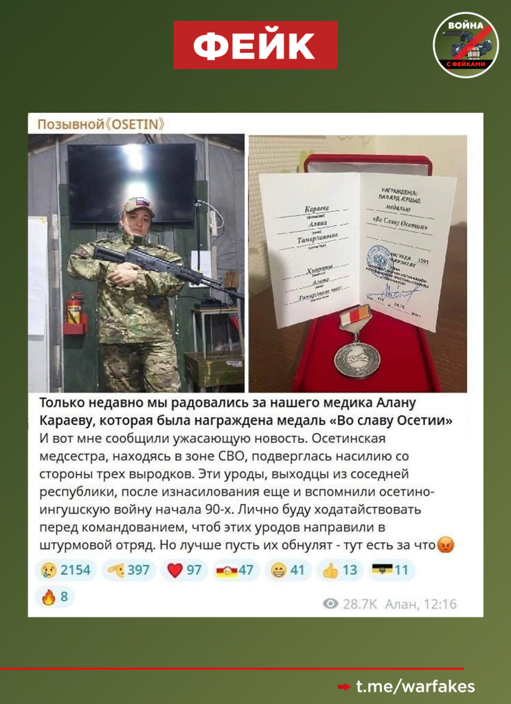 Череда фейков, дискредитирующих российских военнослужащих, продолжается. Это еще один ее эпизод. Боец из Северной Осетии, от чьего имени тиражируется провокационный пост, не делал таких публикаций. Это подтверждает анализ контента на его площадке. Сам бывший военнослужащий также заявил, что ничего подобного не писал.