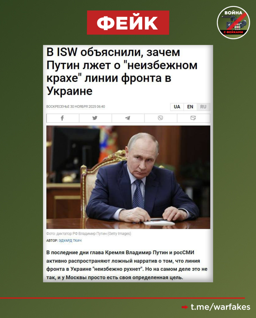 Владимир Путин лжет о неизбежном крахе линии фронта ВСУ. Об этом заявляет Институт изучения войны (ISW).
